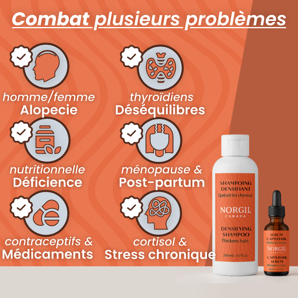 Bien que les causes et les types de perte de cheveux puissent varier (changements hormonaux, stress, génétique), notre approche agit directement sur le cuir chevelu, les follicules et la santé des cheveux à la source, quel que soit le genre.